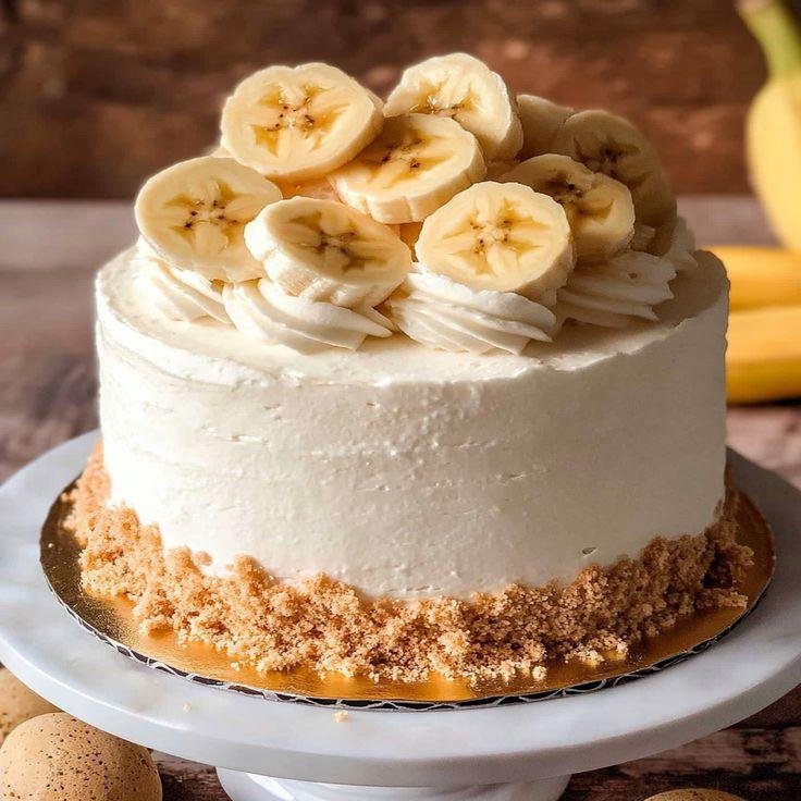 "A soft, moist cake layered with luscious banana cream, offering a rich and creamy dessert experience in every bite."