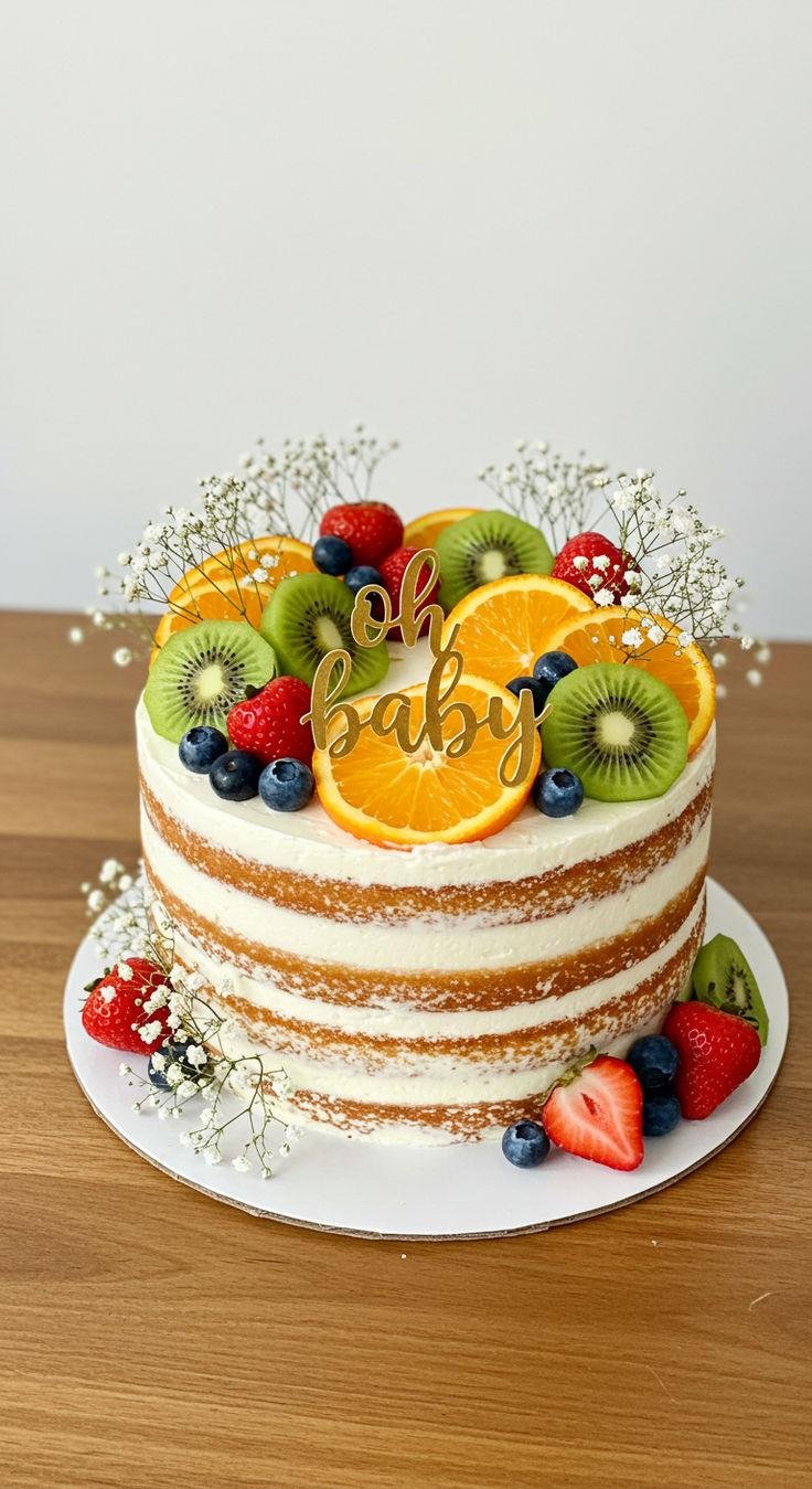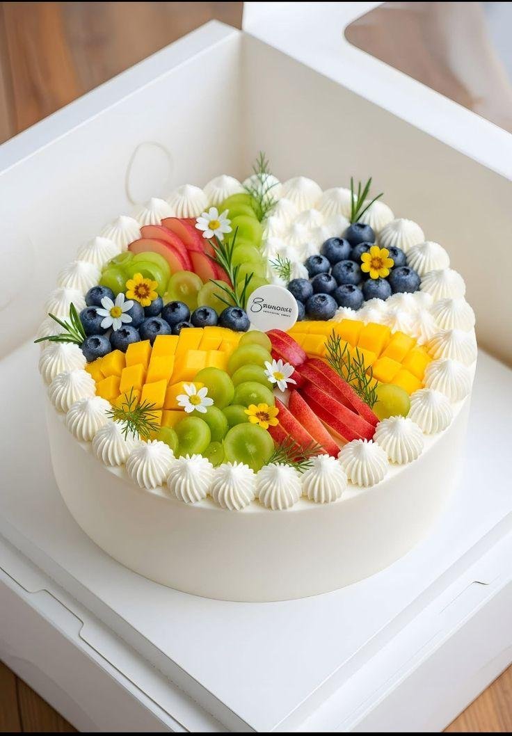 "A colorful and delightful cake topped with an assortment of fresh, juicy fruits, offering a naturally sweet and refreshing treat in every bite."