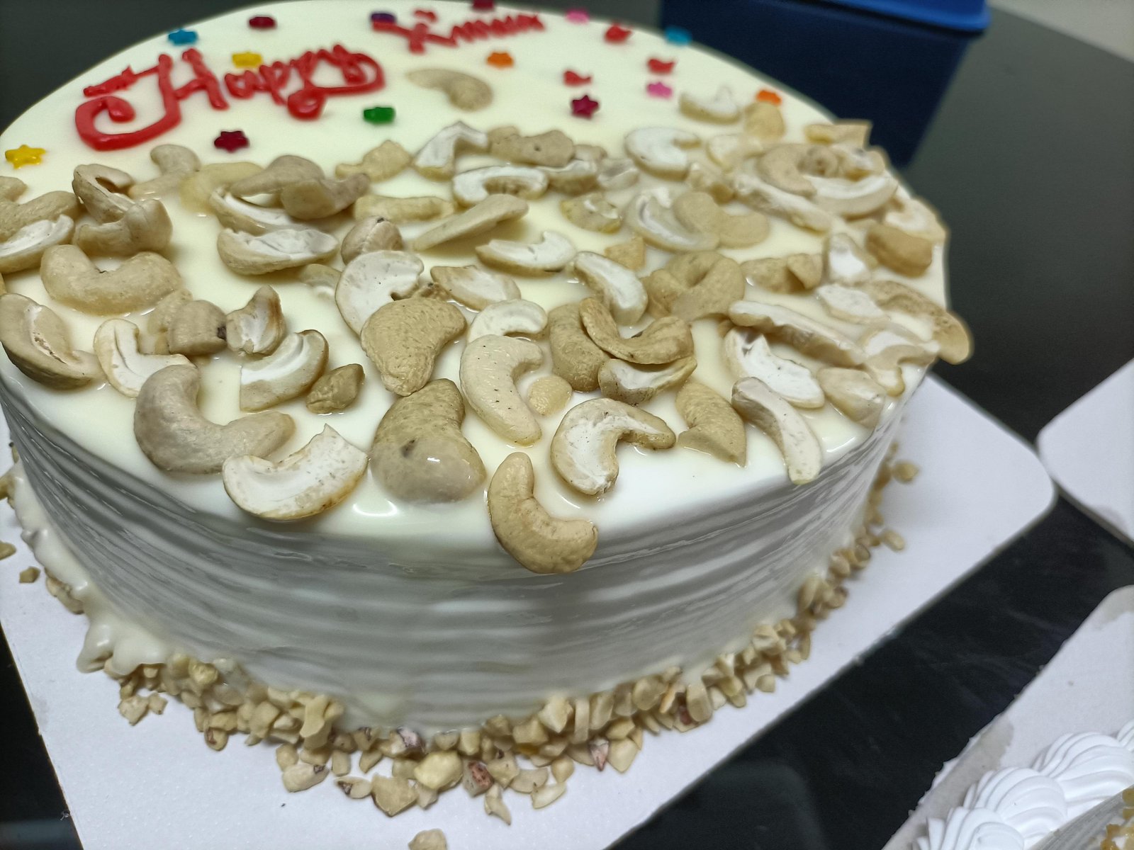 White Chocolate Cashew Cake 🤍🥜 A soft and creamy white chocolate cake enriched with crunchy cashews, blending delicate sweetness with a delightful nutty bite in every slice.